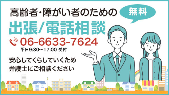 ひとりで悩まず、まず相談!電話(06-6633-7624)高齢者・障がい者に関する相談であれば、ご本人のみならず、ご家族はもちろん、相談支援員さん、ケアマネジャーさんや看護師さん、介護職員さんなど、どなたからでもOK! - 弁護士からお電話します