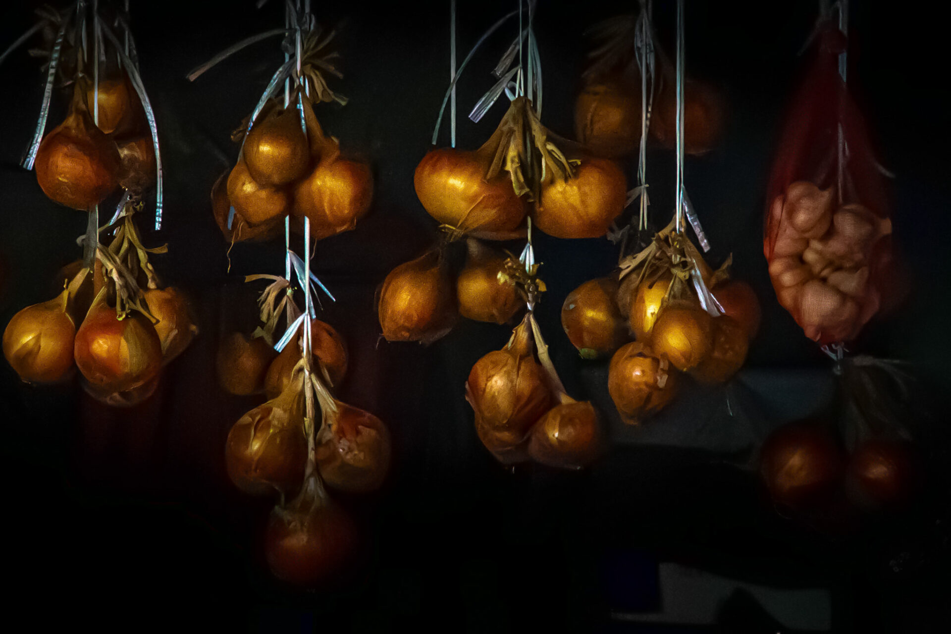 農家の納屋には玉ねぎが干してあります。絵のように渋く、つややかな色でした。