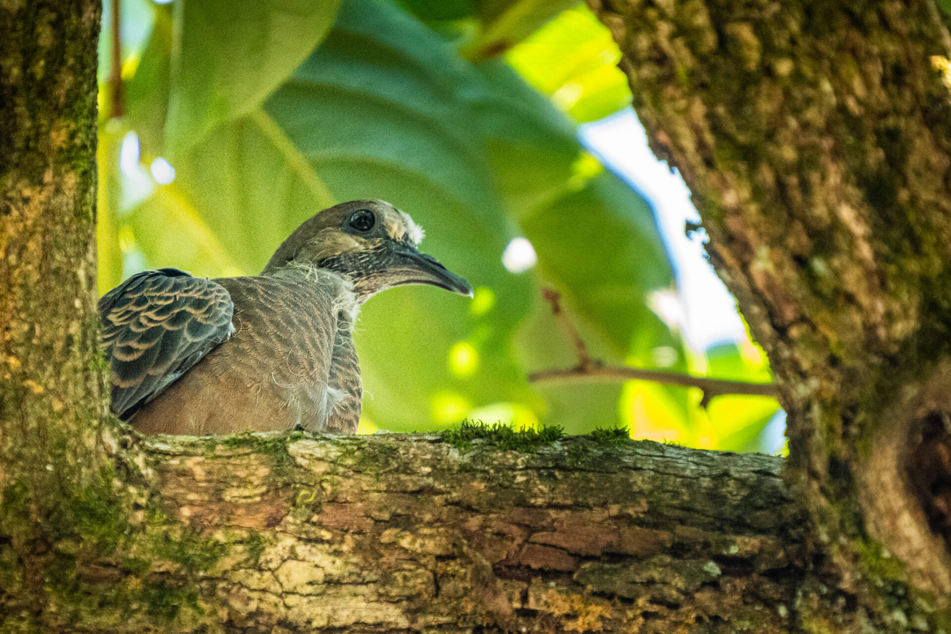 お盆で帰った山形県庄内平野の妻の実家(農家)の庭の柿の木に山鳩が巣を作り、育ったひな鳥が巣立っていくのに出会いました。