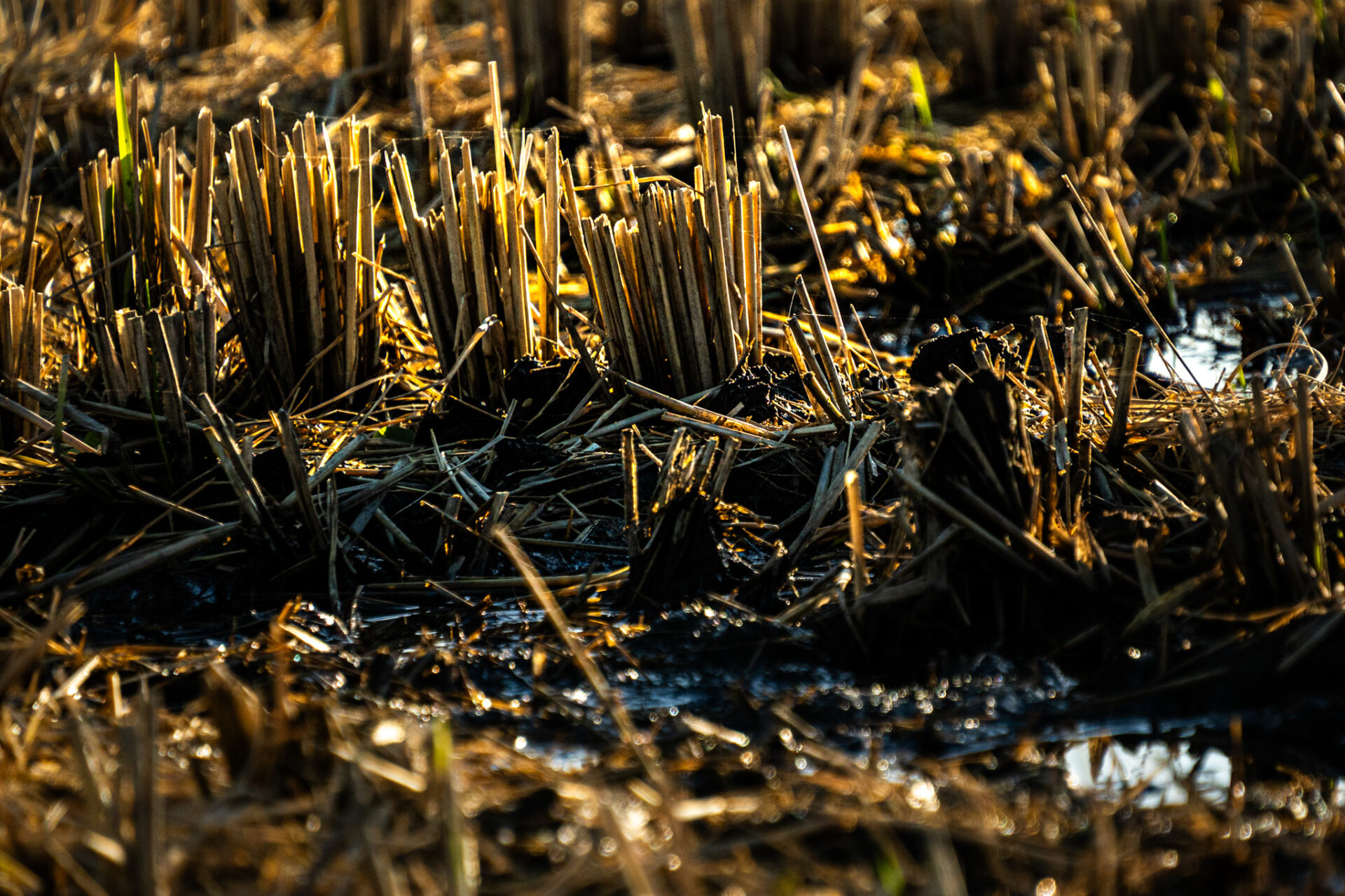 稲刈りあとの稲株。稲わらとともに土にすき込まれて、腐熟させて土壌分解で土を肥沃にし、また来年の米作りに生かされます。