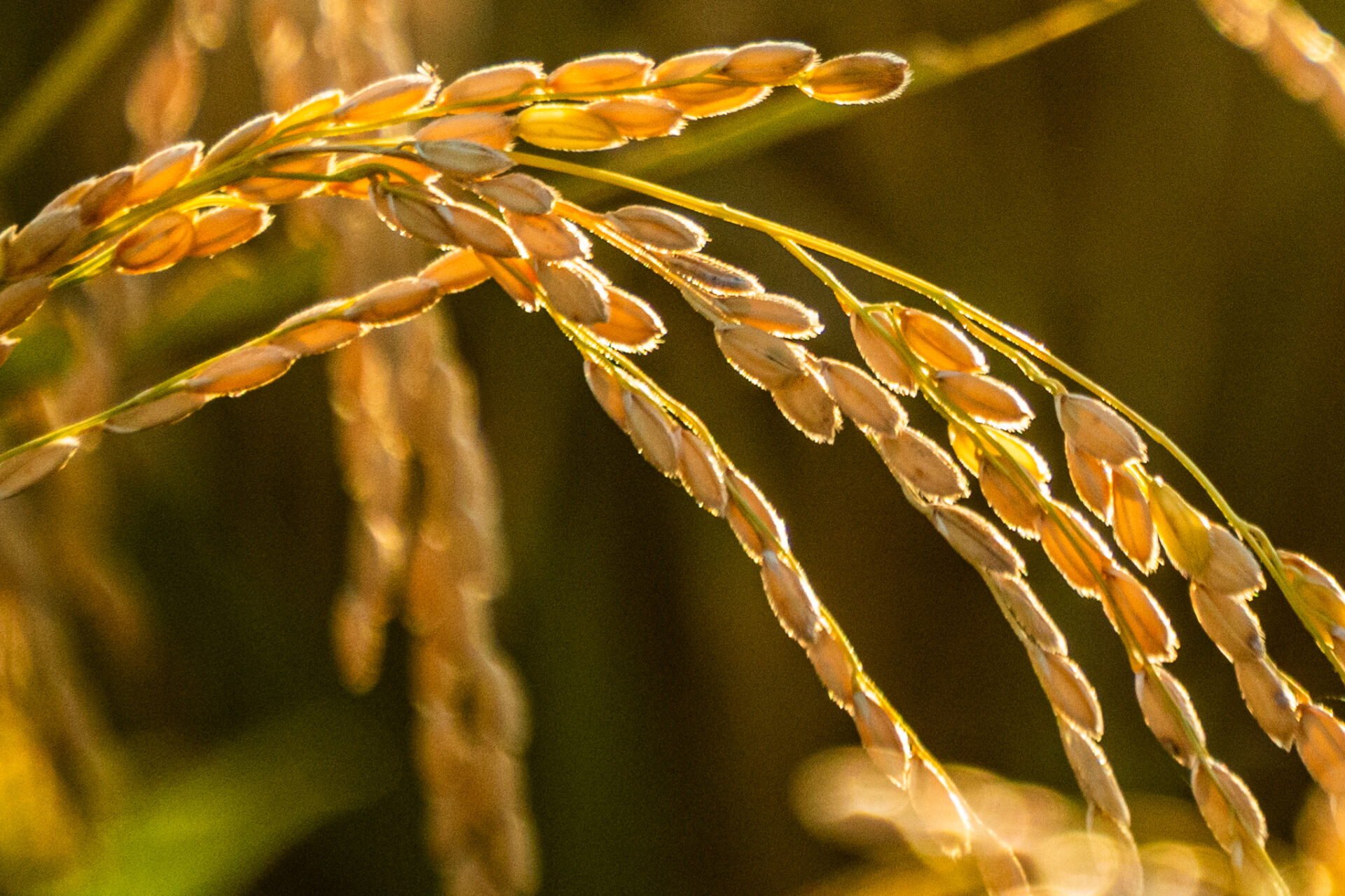 夏の出穂を撮ったあと、10月に法事で訪れた庄内平野の妻の実家のまわりは、稲刈りがほとんど終わった後でしたが、刈りとりを待つ稲穂の一粒一粒が夕日に照らされていました。